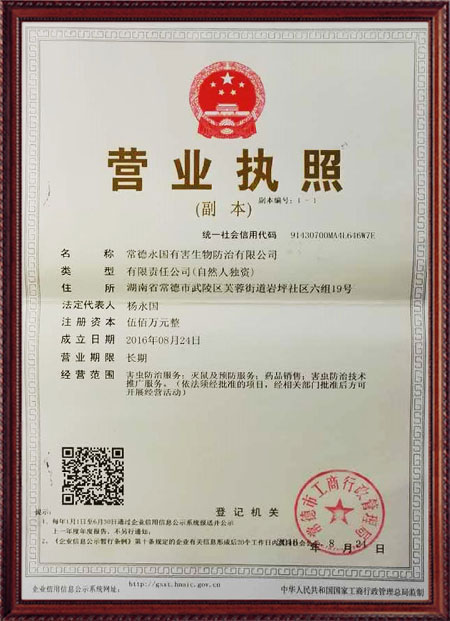 常德永國有害生物防治有限公司以常德市武陵區(qū)永科清潔服務中心來服務,2016年更名為常德永國生物防治有限公司。做這塊已有十多年豐富的理論支持和實經(jīng)驗。技術專業(yè)、器械先進。旨在為賓館、酒店、超市、餐廳、工礦、機關團體、學校、醫(yī)院及家庭提供快捷、貼心的服務,根據(jù)客戶的實際情況、地理位置,解決鼠、蟲害問題。我們承諾:服務滿意后付款,只要一個電話解決您的煩惱問題。